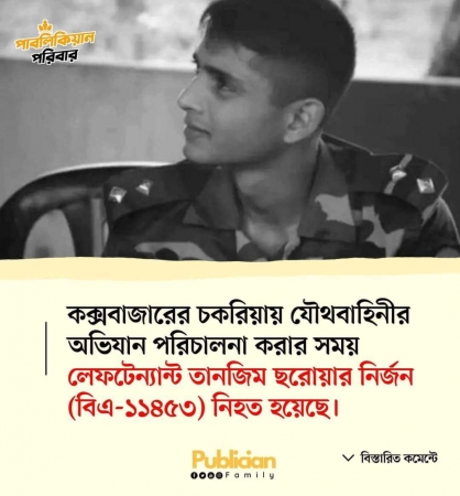 আজ আনুমানিক ০২৩০ ঘটিকায় চকরিয়া উপজেলার ডুলা-হাজারা ইউনিয়ন এলাকায় ৩৯ এসটি ব্যাটালিয়ন এর মেজর মোঃ উজ্জ্বল এর নেতৃত্বে যৌথবাহিনী অভিযান পরিচালনা করার সময় সন্ত্রাসীদের আক্রমণ বিএ-১১৪৫৩ লেঃ তানজিম ছরোয়ার নির্জন আহত হয়। গুরুতর আহত অফিসার কে ১১১ ফিল্ড এ্যাম্বুলেন্স ফাসিয়াখালি আর্মি ক্যাম্পে এবং পরবর্তীতে মালুমঘাট খ্রিস্টান মেমোরিয়াল হাসপাতালে নেওয়া হয়। এবং ০৪৫০ ঘটিকায় রামু সিএমএইচ এর পৌঁছানোর পূর্বেই মৃত্যুবরণ করেন।