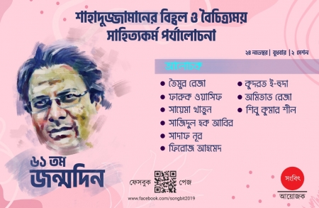 সংবিৎ এর আয়োজনে, আমাদের সময়ের শক্তিমান ও প্রভাবশালী কথাসাহিত্যিক শাহাদুজ্জামান সাহেবের ৬১ তম জন্মবার্ষিকী উপলক্ষে আগামি ২৮ নভেম্বর, বৃহস্পতিবার - দুটো সেশনে ভাগ করে আলোচিত হবে তার জীবন ও কাজ। দেশের সক্রিয় একদল চিন্তক - বুদ্ধিজীবী - ও মিডিয়া পারসোনালিটিদের সঙ্গে আমিও আমার শাহাদুজ্জামান পাঠের অভিজ্ঞতা ভাগ করবো।