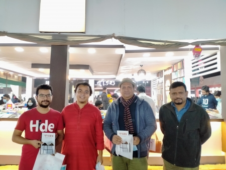 ছবিঃ আমার কলিগ, এবং ঢাবির ইংরেজি বিভাগের কতিপয় সিনিয়র অ্যালামনাসদের সঙ্গে, আমার বই হাতে, মাওলা ব্রাদার্সের স্টলে