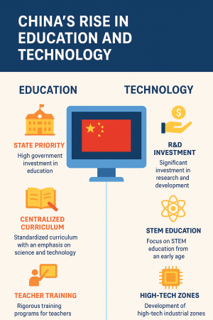 চীন শিক্ষা ব্যবস্থায় রাষ্ট্রীয় নিয়ন্ত্রণ, STEM-এ অগ্রাধিকার, শিক্ষক উন্নয়ন, প্রযুক্তিতে গবেষণা বিনিয়োগ, এবং আন্তর্জাতিক সহযোগিতার মাধ্যমে তাদের শিক্ষা ও প্রযুক্তিকে বিশ্বমানের পর্যায়ে নিয়ে গেছে। যা সত্যি এক যুগান্তকারী পদক্ষেপ।