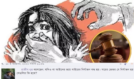 আমাদের ব্লগের একজন অন্যতম জনপ্রিয় ব্লগার, জনাব রাজীব নুর। উনি সব পোষ্টেই কিছু না কিছু মন্তব্য করেন। অভ্যাস খুবই ভালো। তবে মন্তব্যের কোয়ান্টিটি বজায় রাখতে গেলে যা হয়, কোয়ালিটিতে কম্প্রোমাইজ করতেই হয়। তাই বেশীরভাগ সময়েই উনার মন্তব্যের গভীরতা কম। সে যাই হোক, ব্লগার রাজীব নুরের অত্যাশ্চর্য মন্তব্যগুলির ব্যবচ্ছেদ করা আমার এই পোষ্টের উদ্দেশ্য না। গতপরশু উনার একটা মন্তব্যের দিকে আমার দৃষ্টি আকর্ষিত হয়েছে। মন্তব্যটা শিরোনামের ছবিতে দিয়েছি। তবুও আবার দেই, ''যদিও বা আইনের ভয়ে বাইরের নির্যাতন বন্ধ হয়। ঘরের ভেতর যে নির্যাতন হয় সেগুলির কি হবে?''