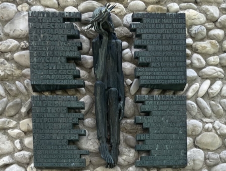 মেমোরিয়ালের ভিতরের দেয়ালে এই ভাস্কর্যটা করা, যেখানে কাটার মুকুট পড়া যীশু গালে হাত দিয়ে বিষন্নভাবে বসে আছেন আর বিভিন্ন ভাষায় লেখা আছে, ''এই ক্যাম্পের প্রতি তিনজন ভিক্টিমের একজন ছিল পোলিশ''সহ আরো কিছু কথা।