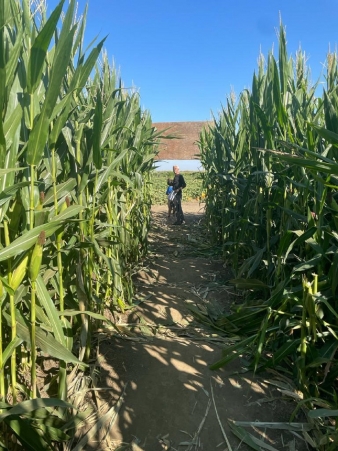 তো, ম্যাপ দেখে এই গোলকধাঁধা থেকে বেরুনোর গেটটার কাছাকাছি পৌঁছানোর পথটা দেখে নিলুম। অনেক হ্যাপা আছে। নির্দেশিত পথ ধরে যাওয়া যাবেনা, মাঝে যেখানে যেখানে পথ নেই সেখানে ভুট্টা গাছের সারির ভেতর দিয়েই যাবো ঠিক করলুম। নাতিকে বললুম – “ব্যাটা এবারে গাছের মধ্যে দিয়ে, মধ্যে দিয়ে যেতে হবে কিন্তু!”