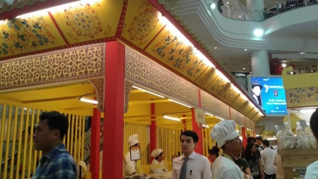 মলের চত্বরে অস্থায়ী নিরামিষ খাবারের দোকানে মানুষের সুশৃঙ্খল ভীড়।