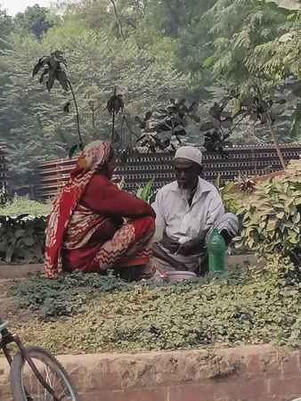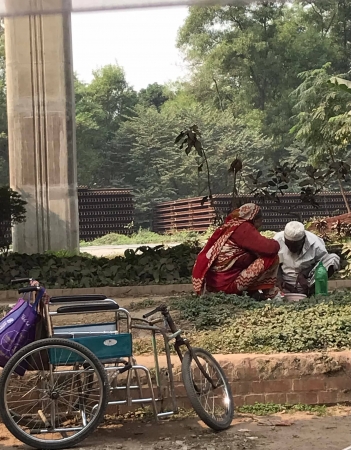 ইংরেজীতে একটা প্রবাদ আছে, “Necessity is the mother of invention” – অর্থাৎ আবশ্যকতা উদ্ভাবনশক্তির প্রসূতি। ঠেকায় পড়ে নান্টু মিঞা এই প্রবাদকে সত্য প্রমাণিত করে নিজের উদ্ভাবনী শক্তি দিয়ে নিজেই একটা হুইলচেয়ার বানাতে সচেষ্ট হলো। ধীরে ধীরে পুঁজি সংগ্রহ করে একটা একটা করে যন্ত্রাংশ কিনে/জোগাড় করে সে একদিন সত্যি সত্যিই একটা হুইল চেয়ার বানিয়ে ফেললো, যেটাতে বসে এখন সে নিজে চালিয়ে ভিক্ষা করতে পারে, লাফানোর আর প্রয়োজন হয় না। আজ দুপুর সোয়া বারটার দিকে আমি রেলগেটে আটকে পড়ায় ভিক্ষুকরা যথারীতি একে একে অনেকেই কাছে আসলো, ভিক্ষা নিয়ে চলেও গেল। একটু পরে মাথা ঘুরিয়ে ফ্লাইওভারের নীচে দেখতে পেলাম নান্টু মিঞা সাথে একজন সহযোগিনীকে নিয়ে আহার গ্রহণ করছে। তার সে সহযোগিনীকে আগে কখনো আমি তার সাথে দেখিনি। হতে পারে সে তার স্ত্রী, হয়তো গ্রাম থেকে নিয়ে এসেছে, অথবা তার সঙ্গী সাথীদের কেউ। খুব ভালো লাগলো রাজপথের পাশে বসে, পৃথিবীর সকল শোরগোল এবং ব্যস্ত-ত্রস্ততা উপেক্ষা করে দু’জনের এক সাথে বসে একান্তে ভাত খাওয়ার এ দৃশ্যটা দেখে। পর পর দুটো ট্রেন যাওয়াতে অনেকক্ষণ আটকা থাকতে হয়েছিল। এটুকু সময়ের মধ্যে তাকে দেখলাম, খাওয়া শেষ করে তার বাহনে আসীন হলো। তার সঙ্গিনী অন্য কোন পাশে চলে গেল, তাকে পরে আর খুঁজে পেলাম না। এই যে একে অপরের সাথে অন্ন ভাগাভাগি করে খাওয়া, এরই নাম মায়া!