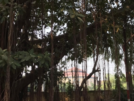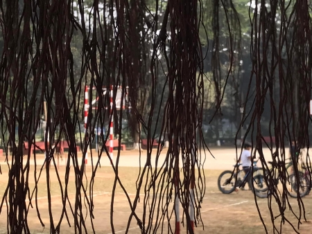 শতবর্ষী বিটপীর শাখা থেকে ভূমিপানে নেমে আসা জট পাকানো শেকড়।