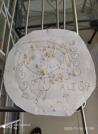 .সম্প্রতি সে ক্যাপিটাল লেটারে তার নামটা লেখা শিখেছে। সে একটা শক্ত কাগজ কেটে পাখিকে খাবার দেয়ার জন্য একটা প্লেট বানিয়েছে। প্লেটের মধ্যে একটা মেয়ের প্রতিকৃ্তি এঁকে তার চতুর্পার্শ্বে অনেকগুলো ভালোবাসার চিহ্ন এঁকে দিয়েছে। নিচে সে তার নামটা ‘ক্যাপিটাল লেটারে’ স্বাক্ষর করতে ভুলেনি। পাখিদেরকে ও বলতে চেয়েছে, ওদেরকে ও ভালোবাসে, এবং ভালোবেসে ওদেরকে খাবার দিয়েছে। ওরা যেন খায়। শিশুদের এ ভালোবাসা অকৃত্রিম!