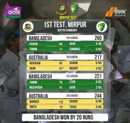 সিরিজ-পূর্ব সংবাদ সম্মেলনে রসিকতা করে মুশফিকুর রহিম প্রশ্ন করেছিলেন, ‘বাংলাদেশ খেললেই ঐতিহাসিক?’ আজ অস্ট্রেলিয়াকে হারানোর পর বাংলাদেশ টেস্ট অধিনায়ক স্বীকার করছেন, ইতিহাসে ঠাঁই নেওয়ার ম্যাচই ছিল এটা।