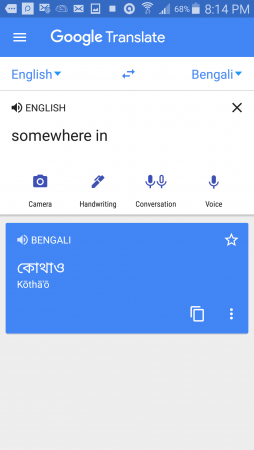 আরেকটা মজার অ্যাপের কথা বলি, এটা Google Translate. একদিন এটা আমার ছেলে আমার ফোনে ইন্সটল করে বলল, "এটা ক্যামেরা দিয়ে ট্রান্সলেট করে", বলে ড্রেসিং টেবিলে রাখা ডাভ স্প্রেতে ফোন ধরতেই দেখা গেল স্প্রেতে লেখা ডাভের জায়গায় লেখা দেখাচ্ছে "ঘুঘু"। ক্যামেরা ছাড়াও হাতে লিখে, মুখে বলে বা কী বোর্ড চেপে ট্রান্সলেট করা যায়। এই অ্যাপটাও আমার ভালো লেগেছে, তাই শেয়ার করলাম। গুগল ট্রান্সলেটরের স্ক্রীনশট নিচে দিলাম। স্ক্রীনশটে যেমন দেখাচ্ছে কলম, সেই কলম টাচ করে আমি হাতে সামহোয়্যারইন লিখেছিলাম। আবার মুখে বললেও অনুবাদ করে দেয়, ক্যামেরা ধরলে ক্যামেরায় অনুবাদ হয়ে যায়।