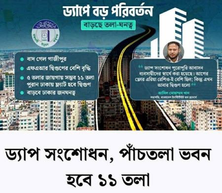 অথচ সম্প্রতি (১৯ অক্টোবর, ২০২৫) ড্যাপ সংশোধন করে ভবনের উচ্চতার এই বাধ্যবাধকতা তুলে নেয়া হয়েছে, এখন পুরানো ঢাকার সরু গলিতেও ১০/১১ তলা ভবন তৈরি করা যাবে। বলা হচ্ছে, বেশি মানুষকে আবাসন সুবিধা দেবার জন্য এখন ঢাকা নগরীকে উপর দিকে বাড়ানো হবে। মূলত আবাসন ব্যবসায়ীদের চাপে রাজউক এই নিয়ম করেছে। পরিবেশবাদীরা বলছেন এর ফলে যে কোন প্রাকৃতিক দুর্যোগে মানুষের দুর্ভোগ সীমাহীন হয়ে যাবে। মানুষের দুর্ভোগ সীমাহীন হলে হোক না!!! ঘুষ আর দূর্নীতি বানিজ্য যারা করে, তাদের কি আসে যায়?
