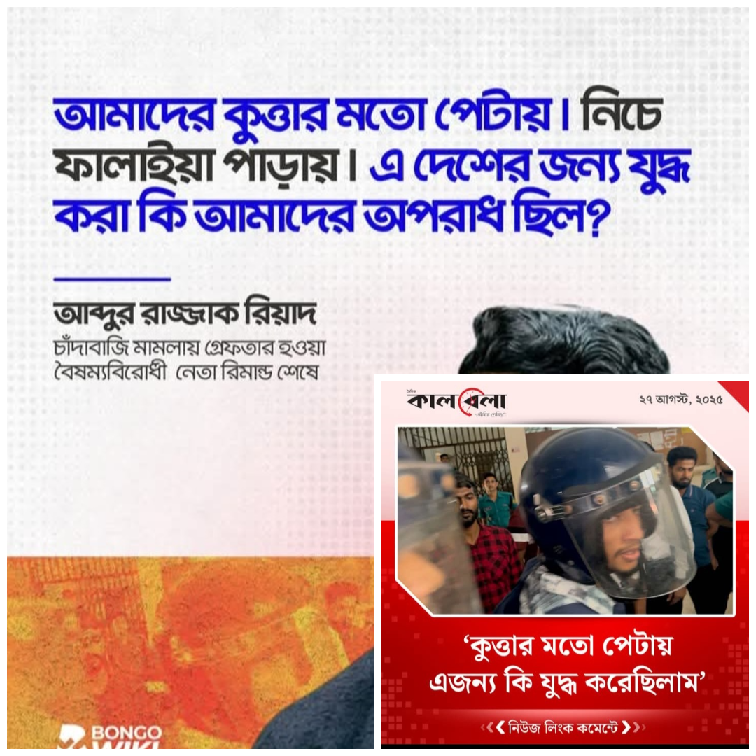 রিয়াদের সাথে নাহিদ ইসলাম এবং তার বাবার গভীর সম্পর্ক ছিল। তারা কি সাহায্য করতে পারে না যে পুলিশ যেন এই ভাইটির সাথে ভালো ব্যবহার করে? একজন জুলাই যোদ্ধাকে কেন কুত্তার মতো পিটানো লাগবে? পুলিশ জুলাই যোদ্ধাদের হাতের কাছে পেলেই যেন প্রতিশোধের নেশায় উন্মত্ত হয়ে ওঠে। তাদের সাজানো সংসার ভেঙে দেওয়ায় দিশেহারা হয়ে পড়েছে।