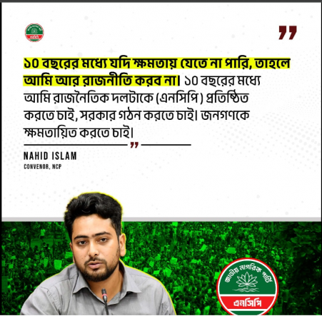 "আমরা ১০ বছরের টার্গেট নিচ্ছি এবং আমি মনে করি, ১০ বছরের মধ্যে বাংলাদেশের রাজনীতিতে আমরা প্রতিষ্ঠিত হব, ক্ষমতায় যাব, সরকার গঠন করব।" জাতীয় নাগরিক পার্টি (এনসিপি)-এর আহ্বায়ক নাহিদ ইসলাম এই লক্ষ্য ঘোষণা করেছেন-ইত্তেফাক ডিজিটাল ডেস্ক। মাত্র এক বছর আগে জুলাই আন্দোলনের একজন সংগঠক হিসেবে পরিচিত ছিলেন এমন একজন তরুণ, এখন তিনি একটি নতুন রাজনৈতিক দলের নেতা এবং দেশের ভবিষ্যৎ নেতৃত্বের প্রার্থী। কিন্তু এটি কি সত্যিকারের সম্ভব?