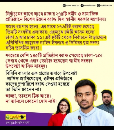 এরপর নাটক গড়াল ঢাকার দিকে। সামনে নির্বাচন। হঠাৎ করেই উপদেষ্টা আসিফ মাহমুদ তাঁর নির্বাচনী এলাকা মুরাদনগর থেকে ভোটার হয়ে গেলেন ঢাকার অভিজাত আসন ঢাকা-১০-এর। আর কাকতালীয়ভাবে, তাঁর মন্ত্রণালয় থেকে নির্বাচনের ঠিক আগে ঢাকার ২৭৪টি ধর্মীয় ও সামাজিক প্রতিষ্ঠানের জন্য ৮ কোটি ২৯ লাখ টাকার বিশেষ বরাদ্দ দেওয়া হলো। এই বরাদ্দের ৯৯ শতাংশই পড়ল তাঁর নিজের আসন এবং নতুন দল এনসিপির দুই নেতা (নাহিদ ইসলাম ও তাসনিম জারা) সম্ভাব্য নির্বাচনী আসনে। অন্যদিকে, ঢাকার বাকি ১৭টি আসনে কোনো বরাদ্দ গেল না বললেই চলে।