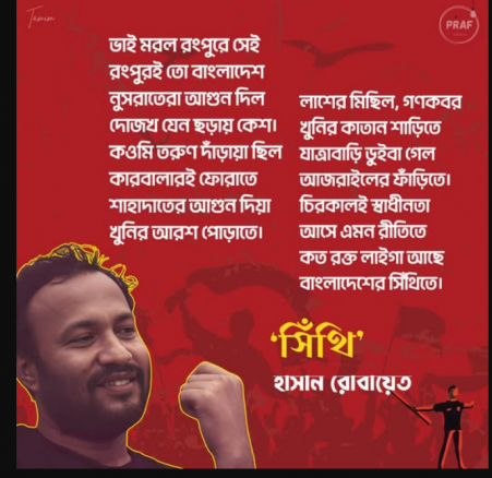 আজকে জুলাই আন্দোলনের একটা কবিতা পাঠ করলাম যেটা পড়ে মাথা হ্যাং হয়ে গেছে। এই কবিতা নাকি সপ্তম শ্রেণীর ‘সপ্তবর্ণা’ বইতে অন্তর্ভুক্ত করা হয়েছে। কবিতার নাম ‘সিঁথি’, লেখক হাসান রোবায়েত। রবীন্দ্রনাথ, নজরুল, জসীমউদ্দীন আর সুফিয়া কামালের পাশে এই কবিতা জায়গা পেয়েছে। পুরো ব্যাপারটা একটু বিস্তারিত আলোচনা করা দরকার ।