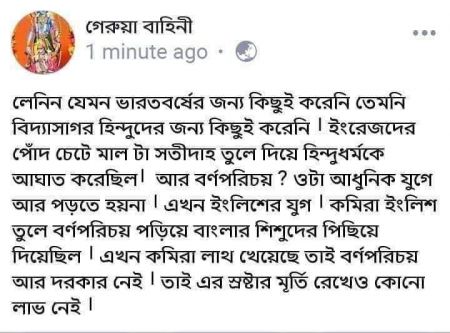 তিনি আমাদের বাঙালিদের জন্য এনেছিলে শিক্ষার আলো, যাতে আমরা বুঝি আমরা শিক্ষিত হতে পারি , আমরা যার হাত ধরে হাঁটতে শিখেছি আজ তার মূর্তি ও তার ভাবধারাকে মাটিতে লুটিয়ে দিতে একবার ও দিধাবোধ করলো না ।
