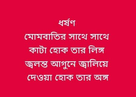 তারপর চিঁড়েছে তার জামা,যত ছিল,নিয়েছে সব কেড়ে গহনা। তারপর চড় ঘুষি সাথে মেরেছে নাকি লাথি । তারপর মাতাল জানোয়ার অমানুষ বেজন্মারা মিটিয়েছে তাদের খিদে,খিদে মিটলেই ইট পাথর দিয়ে তেতলে দিয়েছে মুখ,তারপরেও মিটিনী তাদের ভূখ,শেষে কেরোসিন পেট্রোল এনে ধড়িয়েছে তার দেহ"