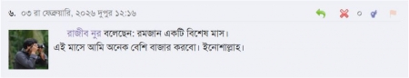 উনি আমার একটি পোস্টে জানিয়েছেন, এই মাসে তিনি অনেক বেশি বাজার করবেন। এতেই বুঝা যায়, উনার কাছে রমজান মানেই প্রচুর পরিমানে বাজার করার মাস, ইবাদত বন্দেগীর নয়।