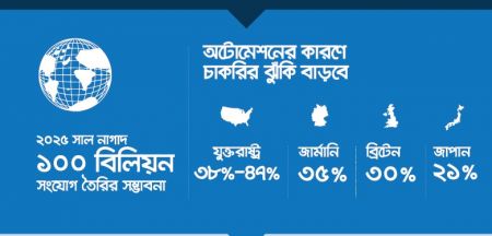 – অটোমেশনের কারণে চাকরির ঝুঁকি বাড়বে (যুক্তরাষ্ট্র: ৩৮% – ৪৭%, জার্মানি: ৩৫%, ব্রিটেন: ৩০%, জাপান: ২১%)