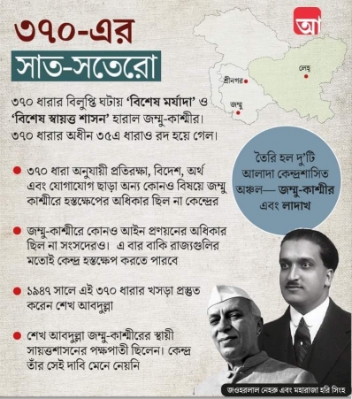 - দেশ ভাগের সময় কাশ্মীর ভারতের কোনো অঙ্গ রাজ্য ছিলো না। আফগানের মতো আলাদা একটা রাজ্য ছিলো। কাশ্মীরের রাজা কিছু শর্তসাপেক্ষ কাশ্মীরকে ভারতের অধিভুক্ত করেন। ৩৭০ আর্টিকেল ঐ শর্তগুলো রক্ষার জন্য করা হয়েছিলো।