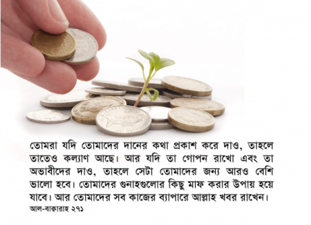সবশেষে একটি কোরআনের একটি আয়াত মনে রাখুন, যারা আল্লাহর সন্তুষ্টির জন্য দান করে এবং তা গোপন রাখে এবং গ্রহীতাকে এজন্য কোনো ধরনের খোঁটা বা কষ্ট দেয় না, তারা পুরস্কৃত হবে। তাদের কোনো ভয় ও দুঃখ-কষ্ট থাকবে না। (পক্ষান্তরে বিপরীতে কী হতে পারে, একবার ভেবে দেখুন!)