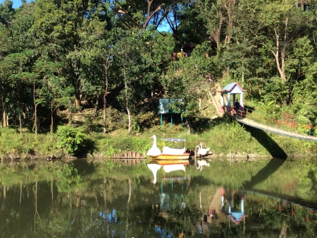 এই ডেঞ্জারাস বাবু এই ডেঞ্জারাস পথ দিয়ে আমাদের নিরাপদেই মেঘলায় নামিয়ে দিল।প্রথমটা মেঘলা সম্পর্কে আমার তেমন কোন ধারনা ছিল না,ঝুলন্ত একটা সেতু আছে তা জানি।কিন্তু আরো আছে একটি মনোরম কৃত্রিম হ্রদ, শিশু পার্ক, সাফারী পার্ক, পেডেল বোট, চিড়িয়াখানা, পিকনিক স্পট ।কিন্তু যতো হাঁটি পথ আর শেষ হয় না,তাও ইট বেছানো রাস্তা,পা একটু পিছলে গেলেই দফা রফা।এই দফা রফার মধ্য দিয়েই আমরা লাফাতে লাফাতেই নামলাম ,কিছু পথ যাই আর দেখি –ঝিল ভরা পানি,রাজ হাঁসের অনাবিল ছুটে চলা,আর নুয়ে পড়া সবুজ গাছের ঝির ঝির পাতা ।সব মিলিয়ে বনের পথে মেঘের আনা গোনা-মেঘলা দিনের কাব্য।আর এই ছো্ট বনেই বাচ্চাদের জন্য ছোট্ট একটা পার্ক বানানো হয়েছে যদিও কলেজ পড়ুয়া বুড়ো শিশুরা তাতে দুলছে।অদ্রি একটা দোলনা পেয়েই মহা খুশি,কে জানে তাকে আর এখান থেকে ফেরানো যাবে কিনা।মেঘলা রেস্ট হাউজে রাত্রিযাপনের জন্য চারটি কক্ষ রয়েছে। প্রতিকক্ষের ভাড়া ২০০০ টাকা ।