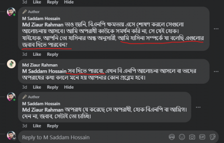 বিশ্বাস করেন, আমার খারাপই লাগে হাসিনার পড়াশুনা না করা বোকাসোকা মাথামোটা কিছু অন্ধ সমর্থকদের জন্য। এই মহিলা কত সুন্দর করে ১৬টা বছর এদের মাথায় কাঁঠাল ভেঙে খেয়ে বিপদের সময় চম্পট দিলো। এদের জন্য যদি হাসিনার বিন্দুমাত্র দরদ থাকতো তবে না পালিয়ে গ্রেফতার হতো। এরশাদ কি চাইলে পালাতে পারতো না? কিন্তু পালায়নি, গ্রেফতার হইছে। বঙ্গবন্ধু কি পালাতে পারতো না? পালায়নি, গ্রেফতার হইছে।