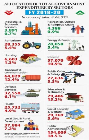 ইংরেজী দৈনিক ডেইলী স্টার থেকে নেওয়া ছবিতে ২০১৯-২০ অর্থবছরে বাংলাদেশ সরকারের ব্যায়ের খাতগুলো দেখা যাচ্ছে। ২০২০-২১ সালে একটু কম-বেশি করে হয়তো প্রায় একই রকম চিত্রই দেখা যাবে। তবে, প্রশ্ন সেটা নয়।