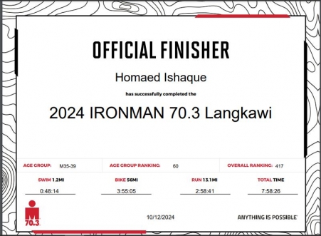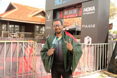 সময় যত যাচ্ছে সূর্যের তাপ আরো বেড়ে চলেছে। পানিয় যা আছে গিলে যাচ্ছি, জেল ও খেয়ে ফেললাম। নিচের দিকে সব অবস হয়ে গেলো মনে হচ্ছে। কিন্তু দৌড় তো থামানো যাবে না, বার বার মনকে তাই বুঝালাম। এয়ারপোর্টের রাস্তায় মারিয়াকে দেখতে পেলাম। তখন সে আমার আগেই ছিলো। একটা জায়গায় এসে ইউটার্ণ নিতে হয় আয়রনম্যান৭০.৩ প্রতিযোগীদের, আর যারা ফুল দিচ্ছে তারা চলে যাবে সামনে। খুব সুন্দর করে সব ধরনের সাইন দেওয়া আছে এবং ভভলেন্টিয়াররাও বেশ সচেষ্ট সব ধরনের সহযোগিতায়। লক্ষ্য করলাম মারিয়াকে আর দেখা যাচ্ছেনা সামনে। সে ফুল আয়রনম্যান এর ট্রেকে ডুকে গেছে। এখন পুলসিরাত পার হবার মত অবস্থা, কারো দিকে তাকানোর সময় নেই। আমি প্রাণপণে গতি ঠিক রাখার চেষ্টা চালিয়ে যাচ্ছি আর বার বার ঘড়ির দিকে তাকাই। হাইড্রোশেন পয়েন্টে আর থামার চেষ্টা করলাম না। শহরের দোকানিদের হাততালি পার হয়ে বালির রাস্তায় ঢুকে পড়েছি। ৮ ঘন্টা শেষ হতে আরো ১০মিনিট বাকি আছে। আমি ফিনিশ লাইন দেখতে পাচ্ছি, পকেট থেকে লাল সবুজ পতাকা বের করে দুহাত উঁচু করে যতটুকু শক্তি বাকি আছে দৌঁড়াতে থাকলাম। আমার চোখে পানি চলে এলো। ফিনিশিং লাইনে ঢুকার মুখে লাল গালিচা বিছানো, সাজ সাজ রব, সংগীতের মূর্ছনায় উত্তেজনায় ভরপুর। আমি ফিনিশ লাইনে দাড়ালাম, মাইকে আমার নাম বলা হলো, আমার দেশের নাম বলা হলো, বুকটা ভরে গেলো আনন্দে। আট ঘন্টার আগেই শেষ করলাম আয়রনম্যান৭০.৩মাইল। স্বপ্নের মত এত দিনের পরিশ্রম আজ স্বার্থক হলো। নিজেই বিশ্বাস করতে পারছিলাম না। হলুদ আর নীলের মিশেলে সুন্দর মেডেল আমার গলায় পরিয়ে দেওয়া হলো। আয়রনম্যান৭০.৩ ফিনিশার লিখা একটা টাওয়াল জড়িয়ে দিলো শরীরে। জীবনের এই অনন্য অনুভূতি হয়ত কখনো ভুলতে পারবো না।