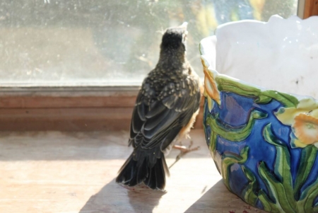 পাখিরা গাছের ডালে নাচানাচি শেষ করে উড়ে আর উড়তে গিয়ে অনেক সময় জানলায় ধাক্কা খেয়ে পরে। কদিন আগে ধাম করে শব্দ শুনে গেলাম গিয়ে দেখি ম্যাগপাই রবিনের বাচ্চা ধাক্কা খেয়ে পরেছে তবে মরেনি। নিজেকে গাছের গুড়ির নিচে লুকিয়ে ফেলছে।