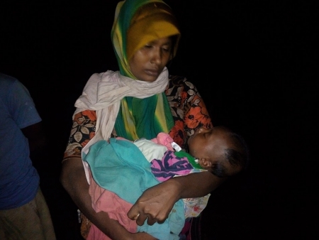 রাত তখন আনুমানিক ১২টা। নবজাতককে নিয়ে রাস্তার ধারে বসে ভোরের প্রহর গুণছেন এক মা। ছবি: নিজ, লম্বাবিল সীমান্ত, উখিয়া, কক্সবাজার।