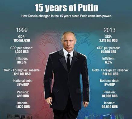 দ্বায়িত্ব নেবার সময় GDP ৭৮% ঋণে জর্জরিত রাশিয়ার ঋণ এখন ১৫ বছর পর ৮%।পেনশন ৪৯৯ রুবল থেকে বেড়ে ১০,০০০ রুবল হয়েছে।১৫ বছর আগে রাশানদের চিত্র ছিল মস্কোর রাস্তায় খাদ্যের সন্ধানে ইতস্তত ঘোরা শুকনো মুখ।আজ,২০১৮ সালের ফুটবল বিশ্বকাপের আয়োজক রাশিয়া।