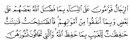“ছেলেরা মেয়েদের ব্যাপারে “ক্বাওয়াম” হবে; কারণ, আল্লাহ্ তাদের কাউকে কারো উপর সুবিধা দিয়েছেন, এবং কারণ তারা তাদের সম্পদ থেকে ব্যয় করবে”। (সূরা নিসা ৪:৩৪ আয়াতাংশ)