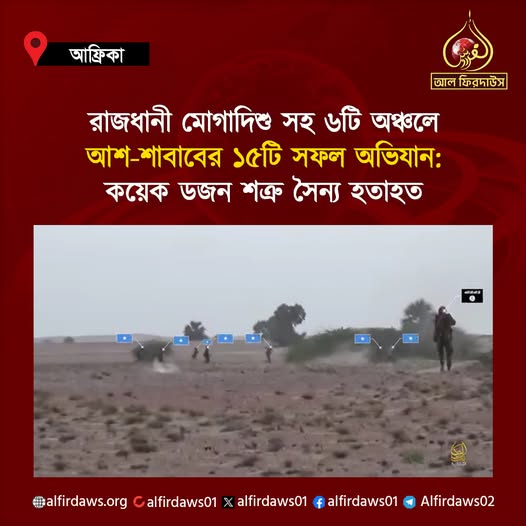 সোমালিয়ার রাজধানী মোগাদিশু, হিরান, জুবা, শাবেলি, বে, এবং জিজু অঞ্চলে সম্প্রতি ক্রুসেডার ও তাদের সহযোগী মোগাদিশু বাহিনীর বিরুদ্ধে কয়েক ডজন অভিযান পরিচালনা করেছেন হারাকাতুশ শাবাব আল-মুজাহিদিন। এরমধ্যে মোগাদিশু বাহিনীর বিরুদ্ধেই মুজাহিদিনরা ১৫টি পৃথক অভিযান পরিচালনা করেছেন। ফলশ্রুতিতে মোগাদিশু বাহিনীর কয়েক ডজন সৈন্য হতাহতের শিকার হয়েছে।