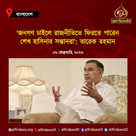 এক সাক্ষাৎকারে বিএনপির চেয়ারম্যান তারেক রহমান বলেছে, জনগণ চাইলে যে কেউ রাজনীতিতে ফেরার সুযোগ পেতে পার এমনকি কুখ্যাত খুনি শেখ হাসিনার সন্তানরাও।
