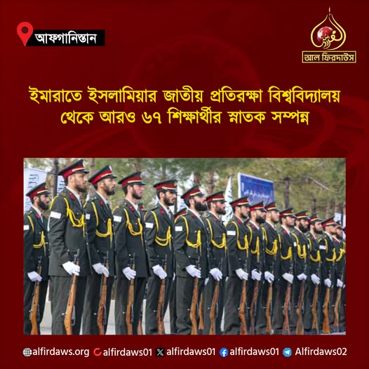 ইমারাতে ইসলামিয়ার জাতীয় প্রতিরক্ষা মন্ত্রণালয় জানিয়েছে, হযরত আবু উবাইদাহ ইবনে জাররাহ (রা.) জাতীয় প্রতিরক্ষা বিশ্ববিদ্যালয়ের ১৭তম ব্যাচের ৬৭ জন শিক্ষার্থী স্নাতক সম্পন্ন করেছেন। বিশ্ববিদ্যালয়টি প্রতিরক্ষা খাতে দক্ষ ও যোগ্য জনবল তৈরিতে গুরুত্বপূর্ণ ভূমিকা পালন করে আসছে।