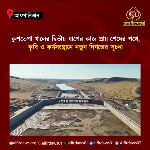 কুশতেপা খালের দ্বিতীয় ধাপের খননকাজ প্রায় শেষ পর্যায়ে পৌঁছেছে বলে জানিয়েছে ইমারাতে ইসলামিয়া আফগানিস্তানের জাতীয় উন্নয়ন কোম্পানি। প্রতিষ্ঠানটির তথ্যমতে, এই ধাপের খননকাজের ৯৮ শতাংশ সম্পন্ন হয়েছে এবং খালের বাঁধ নির্মাণ কাজও দ্রুত গতিতে এগিয়ে চলছে। সংশ্লিষ্টরা আশা করছেন, কাজ সম্পন্ন হলে এটি দেশের কৃষি ও অর্থনীতিতে গুরুত্বপূর্ণ অবদান রাখবে।