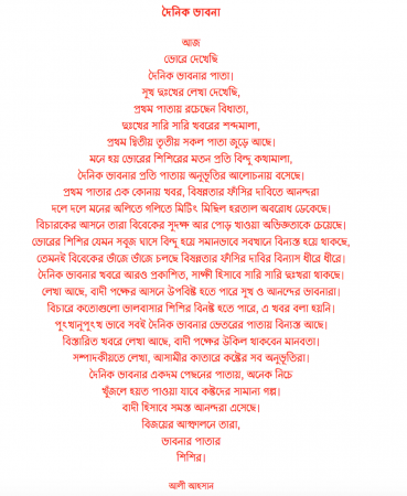 এটা আকৃতিমূলক কবিতা। প্রতিদিন আমাদের মনের ভেতর এমন অসংখ্য ভাবনা শিশির বিন্দুর মতো ঝুলে থাকে আমাদের মনের জমিনে। ভাবনাগুলো যেন দৈনিক পত্রিকার পাতায় লেখা, প্রথম পাতায় কিছু ভাবনার খবর, দ্বিতীয় বা তৃতীয় পাতায়, ইত্যাদি। এমন চিন্তাকে কাজে লাগিয়ে এই আকৃতিমূলক কবিতা, তাই কবিতার আকার এখানে শিশির বিন্দুর মতো।