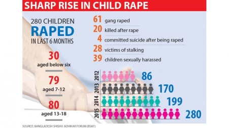 ৬ আগস্ট, ২০১৫ এর ‘ঢাকা ট্রিবিউনের একটা রিপোর্টে ২০১৫ সালের প্রথম ৬ মাসেই ২৮০ জন শিশু ধর্ষণের কথা বলা হয়’। নিচের ছবিতে একটা পরিসংখ্যান দেখাচ্ছে। সেখানে আমরা স্পষ্ট দেখতে পাচ্ছি ২০১২ থেকে ২০১৫ পর্যন্ত শিশু ধর্ষণ কী পরিমাণে বেড়েছে; ৮৬-২৮০ জন। ধর্ষিতদের মধ্যে ৭-১২ বছর বয়সের আছে ৭৯ জন। এবং সব থেকে ভয়ঙ্কর খবর – মাত্র ৬ বছরের নিচেই আছে ৩০ জন। ২০ জনকে ধর্ষণ করার পর মেরে ফেলা হয়েছে। ৬১ জনকে দলবল সহ ধর্ষণ করা হয়েছে এবং ৪ জন আক্রান্ত হওয়ার পর আত্যহত্যা করেছে। এবং আরেকটি খুবই গুরুত্বপূর্ণ লক্ষ্য করার মতন বিষয় হল এটা ঘটেছে মাত্র ৬ মাস সময় সীমার মধ্যে। কিন্তু এই পরিসংখ্যান যেটা বলছে না তা হল আন-রিপোর্টেড ভিক্টিমের সংখ্যা কত? রেপ হওয়ার পরও সামাজিক মান-সম্মান, লজ্জা এবং পুনরায় নির্যাতিত হওয়ার ভয়ে প্রকৃত ভিক্টিম দের বেশ বড় অংশই এই পরিসংখ্যানের বাইরে থেকে যাচ্ছে।