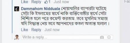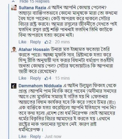 যাই হোক ফেসবুকে একটি কমেন্ট আসলো, “মুসলিম সমাজ যদি সিদ্ধান্ত নেয় তবে আপনাদেরকে কতল করা অত্যন্ত হালাল।” কারা এই ‘মুসলিম সমাজ’ এ প্রশ্নটি আর করলাম না। তাকে প্রশ্ন করা হয় যে, “এ আইন আপনি কোথায় পেলেন? ব্যক্তিগতভাবে কোনো মানুষকে মারা তো কখনো বৈধ হতে পারে না। কেউ অপরাধ করলে সেটার বিচার রাষ্ট্র করবে। আমরা রসুলের জীবনীতে দেখতে পাই যতদিন রসুল রাষ্ট্রশক্তি পান নাই ততদিন তিনি কাউকে দণ্ডও দেন নাই।”
