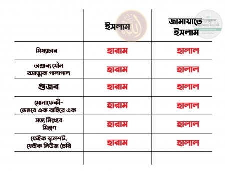 আমি নই বলেছেন: মজার ব্যাপার হল চার্ট অনুযায়ী জামাত যেগুলারে হালাল মনে করে বাংলাদেশের অন্য সব দলও সেইম করে। যদিও তার নিজেদের ইসলামি দল দাবী করেনা কিন্তু ভোটের সময় হাতে তসবি-মাথায় টুপি কিংবা হিজাব পরে ইসলামের ফায়দা ঠিকই নিতে চায়।