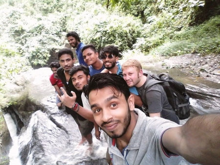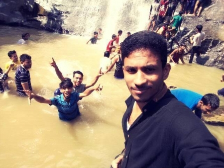 এইদিক দিয়েই ঝর্নায় উঠতে হবে। ছোট পাহাড়ি ঝিরি বয়ে যাচ্ছে পাশ দিয়ে। পাথুরে ঝিরি । পা পিছলালেই মট করে ভেঙ্গে যাবে হাত-পা। ফ্রিজের পানির মত ঠাণ্ডা পানি। জুতা খোলে ঝিরিটা পার হলাম। রাস্তা বেশ পিচ্ছিল হয়ে আছে। ওদিক থেকে ঝর্নায় ঝাঁপাঝাঁপি করে ফিরে আসা মানুষগুলোর গায়ের পানিতে রাস্তার অবস্থা বেশ খারাপ। আমি কুড়িয়ে একটা লাঠি নিলাম সাথে। হাঁটতে বেশ সুবিধা। সবাই হাসাহাসি করছে। তবুও গা করলাম না। নিজে বাঁচলে বাপের নাম। হাসাহাসি পরে। এদিকে শুরু হয়ে গেছে সেলফি উৎসব। এই সেলফি তুলাতুলিতে সবার আগে থাকে শুভ ভাই। সবাই তুলছে, যে যেদিক থেকে পারে। হিম শীতল পানির পাথুরে পাহাড়ি ঝিরিতে সেলফি!