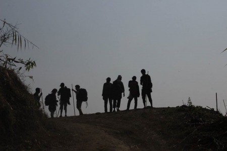 আবার যাত্রা শুরু করলাম । এখন পথ একটু খারাপ । পাহাড় বেয়ে উঠতে হচ্ছে আবার নামতে হচ্ছে । আবার পাহাড় বেয়ে উপরে। আবার নিচে । এরকম তিনটা পাহাড় পার হওয়ার পর এক পাহাড়ের চুড়ায় জিরালাম কিছুক্ষণ । বিস্কিট-টিস্কিট খেলাম । আবার হাঁটা শুরু করলাম । শক্তি ক্ষয় হয়ে আসতে শুরু করলো ধীরে ধীরে । এবার নিচে নাইমা আবার খাড়া উঠতে হচ্ছে । সবার আগে আগে আমি আর খাপকুম । ক্লান্তি ভুলে থাকার জন্য খাপকুমের সাথে গল্প জুড়ে দিলাম । তার থেকে জানলাম বমরা খ্রীষ্টান । এরা ঘটা করে বড়দিন পালন করে । ওই সময় গয়াল জবাই করা হয় ওদের পাড়ায় । মিশনারীরা কত আগে ঢুকে গেছে এই জঙ্গলে ভাবলে অবাক লাগে । এখন আবার কোন মিশনারী নাই । বমরাই গীর্জার ফাদার । তবে এখনো নাকি কেউ কেউ বিদেশ থেকে চিকিৎসা সহায়তা দিতে আসে।