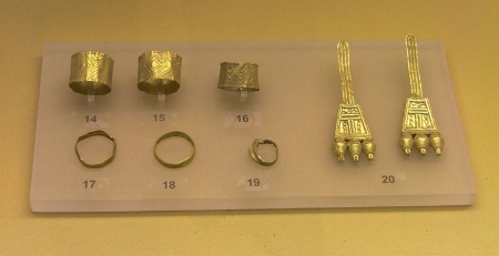 একজন গর্ভবতী ধনাট্য মহিলার সমাধি থেকে প্রাপ্ত সোনার আংটি ও কানের দুলের জোড়া, আনুমানিক খ্রিস্টপূর্ব ৮৫০ অব্দ।