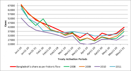 যৌথ নদী কমিশনের হিসাব মতে, ভারত এ বছর বাংলাদেশকে গড় প্রবাহের চেয়ে ৩৫ হাজার ১৪১ কিউসেক পানি কম দিচ্ছে।