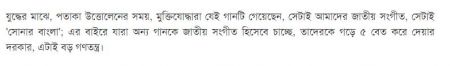 যুদ্ধের মাঝে, পতাকা উত্তোলেনের সময়, মুক্তিযোদ্ধারা যেই গানটি গেয়েছেন, সেটাই আমাদের জাতীয় সংগীত, সেটাই 'সোনার বাংলা'; এর বাইরে যারা অন্য গানকে জাতীয় সংগীত হিসেবে চাচ্ছে, তাদেরকে গড়ে ৫ বেত করে দেয়ার দরকার, এটাই বড় গণতন্ত্র।