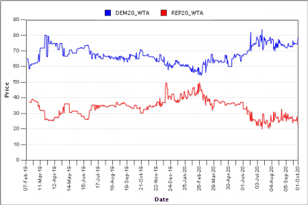 উপরের গ্রাফটি (X-axis: তারিখ , Y-Axis: ষ্টকের মুল্য ) আমেরিকার আইওয়া রাজ্যের, আইওয়া ইউনিভার্সিটির ষ্টক-মার্কেটে (ফিউচার প্রেডিকশান মার্কেট) আমেরিকান প্রেসিডেন্ট নির্বাচনে ডেমোক্রেটিক প্রার্থী জো বাইডেন ও রিপাবলিকান প্রার্থী ট্রাম্পের শেয়ারের মুল্য দেখাচ্ছে: নীল লাইনটি , আমেরিকান মুদ্রা সেন্টে প্রার্থী জো বাইডেন এবং লাল লাইনটি হচ্ছে ট্রাম্পের শেয়ারের মুল্য।