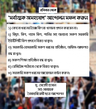 সারাদেশে ছাত্র-নাগরিকদের শান্তিপূর্ণ আন্দোলনে হামলা করে খুনের প্রতিবাদ ও ৯ দফা দাবিতে আগামীকাল শনিবার সারাদেশে বিক্ষোভ মিছিল ও রবিবার থেকে অনির্দিষ্টকালের জন্য "সর্বাত্মক অসহযোগ" আন্দোলনের ডাক দেওয়া হলো।