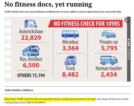 More than 70,000 vehicles have not had their fitness certificates renewed in 10 years. এখানে শুধু ফিটনেস ডকুমেন্টের বিবেচনা এসেছে, বাস্তবের যান্ত্রিক ফিটনেস হিসেব করলে এই সংখ্যা কয়েক গুণ হয়ে উঠতে পারে!