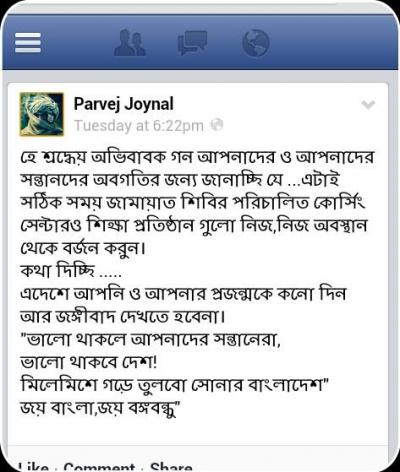 হে শ্রদ্ধেয় অভিবাবক গন আপনাদের ও আপনাদের সন্তানদের অবগতির জন্য জানাচ্ছি যে ...এটাই সঠিক সময় জামায়াত শিবির পরিচালিত কোর্সিং সেন্টারও শিক্ষা প্রতিষ্ঠান গুলো নিজ,নিজ অবস্থান থেকে বর্জন করুন।