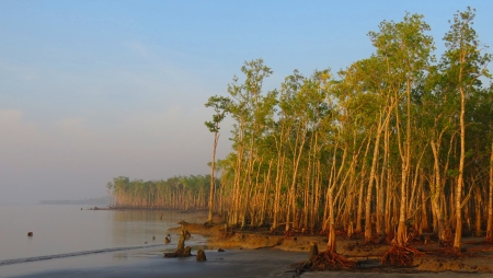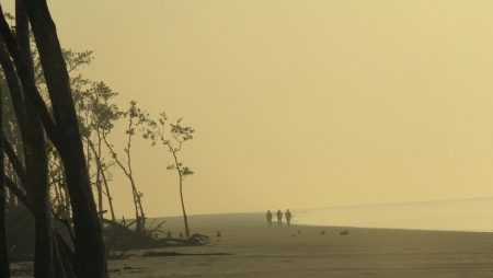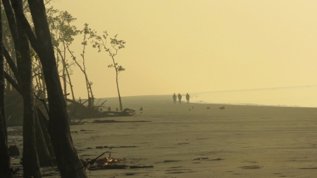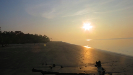সকাল ঠিক ছয়টায় আমরা রওনা হলাম আমাদের প্রমোদতরী হতে কটকা খাল এর দিকে। খাল এর পথ ধরে কিছুটা এগিয়ে গেলি একটা জেটি দেখা গেল, সেখানে ভেড়ানো হল আমাদের ইঞ্চিন নৌকা, সবাই একে একে নেমে এলাম। এরপর আধঘন্টার মত ট্রাকিং, এই পথটুকু আমার খুব পছন্দের। গতবারের সুন্দর ভ্রমণে জামতলা সৈকত থেকে ফেরার পরে আমাদের দল এখানে বিশাল এক হরিণের পালের মুখোমুখি হয়েছিল। সেই জায়গাটা অতিক্রম করতে করতে খুঁজছিলাম “ওয়াচ টাওয়ার”; কিন্তু চোখে পড়লো না। হয়তো ভেঙ্গে পড়েছে অথবা সরিয়ে নিয়েছে; এমনটাই জানা গেল বনরক্ষী ভাই এর নিকট হতে। পূর্ব দিগন্ত রেখা ধরে উদিত সূর্যের কুসুম লাল কিরণ চারিদিকে মাখামাখি হয়ে মায়াবী এক পরিবেশ তৈরী করলো। সবাই নিজের মত করে ছবি তুলতে তুলতে এগুতে লাগলাম জামতলা সৈকতের দিকে।